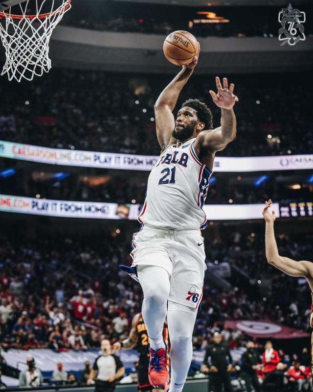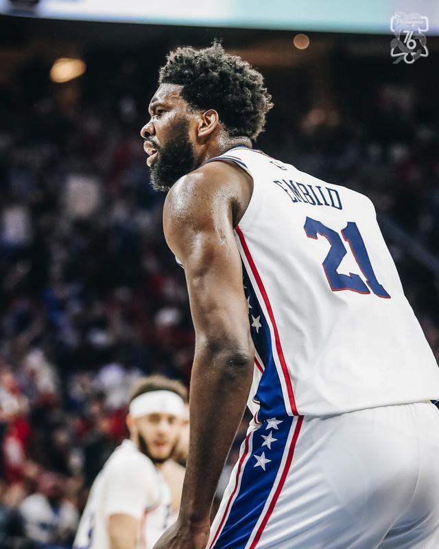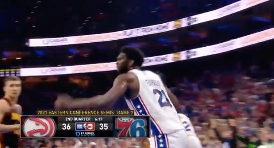 比赛进行到第二节还剩6分29秒的时候,费城发动快攻反击,身高2米13的恩比德自己带球一条龙杀到了篮下。