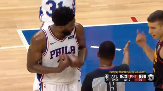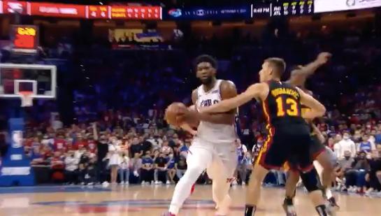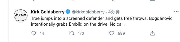 从慢动作回放来看,在恩比德启动的同时,博格达诺维奇伸手打在了恩比德的手上,这是明显的2加1,但是裁判不为所动,无视了老鹰后卫的犯规动作。专家Kirk Goldsberry吐槽裁判双标,“特雷-杨跳远造犯规,获得罚球。博格达诺维奇故意犯规,没有吹罚。”
