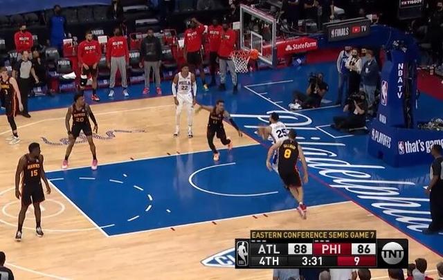 当时西蒙斯背打加里纳利转身进入篮下,可他面对空篮不上,却送给了左侧跟进的塞布尔,后者造成犯规两罚中一,落后1分。