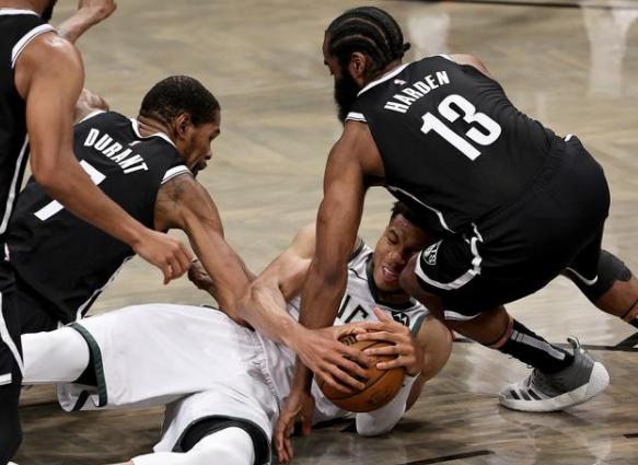 图说:“字母哥”倒地和哈登、杜兰特拼抢 网络图