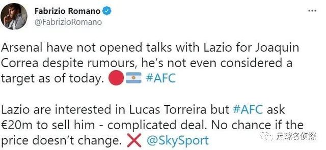 转会专家罗马诺发推:尽管有那些传闻,但阿森纳尚未和拉齐奥就华金-科雷亚展开谈判,截止今天,阿森纳甚至没有考虑过科雷亚作为目标。