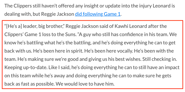 “他是我们的领袖”雷吉-杰克逊在快船不敌太阳的首场比赛后说道,“一个仍对他的球队重新信心的人,我们知道他正在与一些东西斗争,他正在尽其所能回到我们身边。他一直在这里, 他一直身处球队阵中。他确实能让我们能有足够好的心态,并且给了我们最好的祝愿。就像我说的那样,他正在竭尽全力对这支球队产生影响,并且他也会确保自己能尽快回来。”