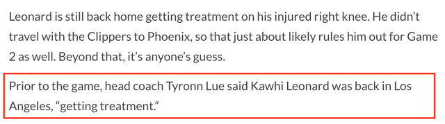 当然,对目前这支快船来说最重要的还是科怀-伦纳德的伤病问题。在赛后,快船主教练泰伦-卢透露科怀-伦纳德的伤病情况: