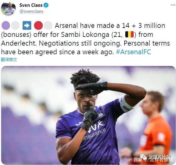 比利时方面记者SC发推表示,阿森纳已经斥资1400万欧元加300万浮动再次报价了安德莱赫特21岁的中场洛孔加,谈判仍在进行中。个人条款一周前就已经达成协议了。