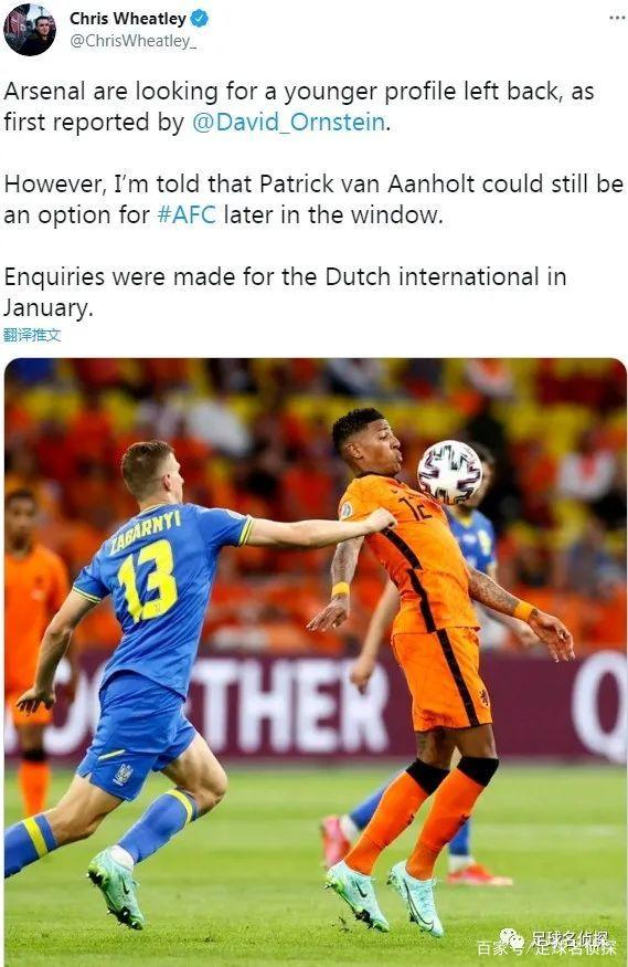 CWY发推表示:正如DO率先报道的那样,阿森纳正寻求签下一名年轻的左后卫,不过我被告知范安霍尔特依然有可能在转会窗的后期成为阿森纳的一个选择。枪手在一月份时就询问过收购这名荷兰左后卫的可能性。