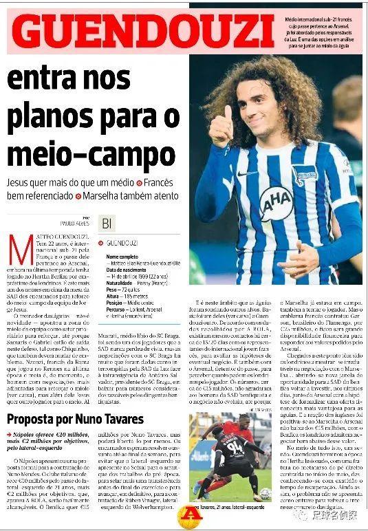 葡媒球报消息,本菲卡已经接触了古恩多兹的阵营,以打探交易是否有可能完成,此外本菲卡还联系了阿森纳,枪手的要价为1500万欧元,不过这个要价让本菲卡的高层感到不太满意(didn’t please the leaders of Benfica),他们将尝试谈判一个比这低很多的转会费。