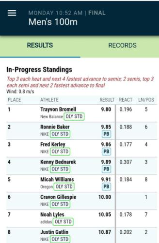 本次比赛第四名贝德纳尔克稳在0.307秒的起跑严重失误情况下,跑出了9秒89的成绩排名第四位,让人感到非常恐怖,如果他有一个0.150左右的正常起跑反应,那么他本次将会跑出9秒74左右的成绩,稳拿本次比赛的冠军,也让人感到十分可惜。不过他主项是200米,接下来的200米比赛中,他有望击败莱尔斯,拿下美锦赛冠军,也有望进入美国男子4乘以100米接力队,去挑战牙买加队2012年创造的世界纪录36秒84。