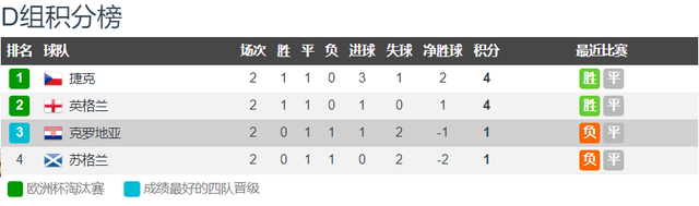 第一:胜者出线,打平携手出局!欧洲杯D组两轮战罢,克罗地亚和苏格兰均积1分,克罗地亚先是0-1不敌英格兰,再是1-1战平捷克;苏格兰先是0-2不敌捷克,再是0-0逼平英格兰。克罗地亚对阵苏格兰,只有取胜的一方才能出线,打平的话携手出局。