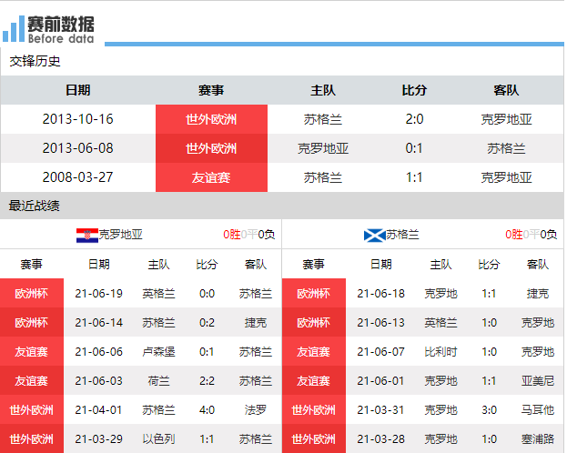 双方近3次交手,克罗地亚1平2负,未尝胜绩!克罗地亚各项赛事近6场比赛,2胜2平2负,其中0-1分别输给英格兰和比利时,如今的格子军很难对抗强队;苏格兰各项赛事近6场比赛,2胜3平1负。