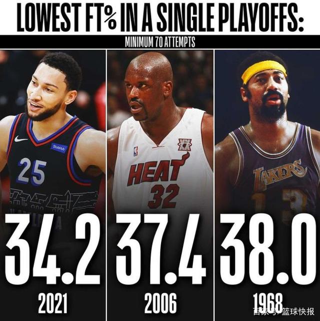 西蒙斯除了没有投射威胁,毫无攻击性可言外,更让人感到无法容忍的是他的罚球命中率。今年季后赛,西蒙斯的三分命中率0%,罚球命中率34.2%,刷新NBA季后赛最差罚球纪录,NBA历史第二差是奥尼尔,罚球命中率37.4%!值得一提的是,西蒙斯今年季后赛总共罚丢48球,比篮网(32)、太阳(29)今年季后赛全队罚丢的球还多。