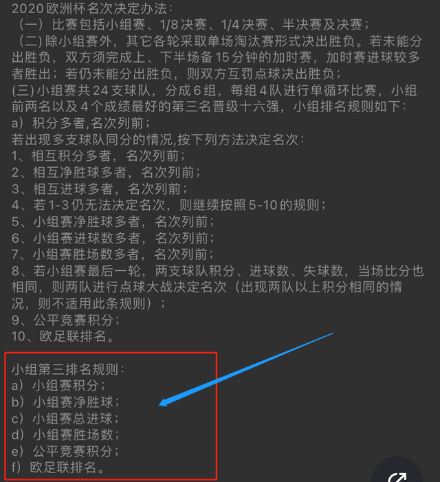 本届欧洲杯4个小组的第三名有机会晋级16强(总共6个小组),以目前的积分来看,芬兰、乌克兰、克罗地亚、苏格兰、斯洛伐克、西班牙、波兰、德国、葡萄牙和匈牙利理论上均有出线的机会。总的来说,出线形势错综复杂,比国足40强的算分难多了,来看看下图关于小组第三名的晋级规则。