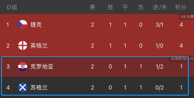 D组:克罗地亚vs苏格兰。如果这两支球队打平,小组赛的积分都只有2分,比不过乌克兰的3分。如果克罗地亚和苏格兰当中任何一支球队取胜,会从积分上超过乌克兰,出线希望将变得渺茫。