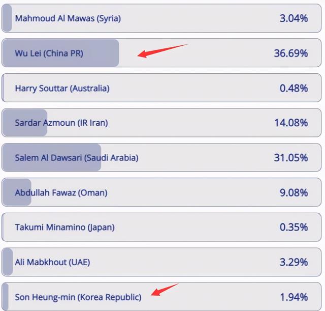 而昔日的亚洲一哥孙兴慜,这次得票率只有1.94%,只有武磊的19分之1。也就是说,单从这次投票结果看,武磊比孙兴慜强19倍。当然,在欧洲赛场,孙兴慜的表现要远比武磊强,从德转身价上说,武磊也只是孙兴慜的零头,但这一切并不意味着武磊永远输给孙兴慜。