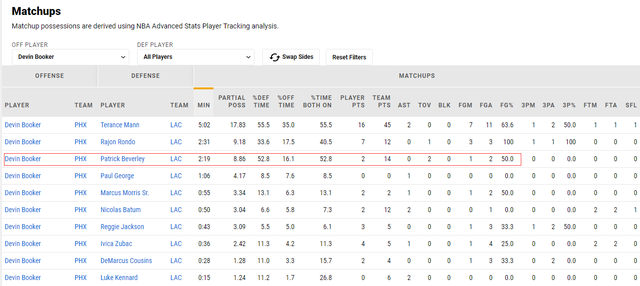 当然,快船其他球员如雷吉-杰克逊、祖巴茨、乔治甚至是考辛斯在西决第一场对布克的防守也是不错的。但他们的防守时间都在1分钟甚至不到1分钟(考辛斯是28秒),相对参考价值不如主防了布克2分19秒的贝弗利。