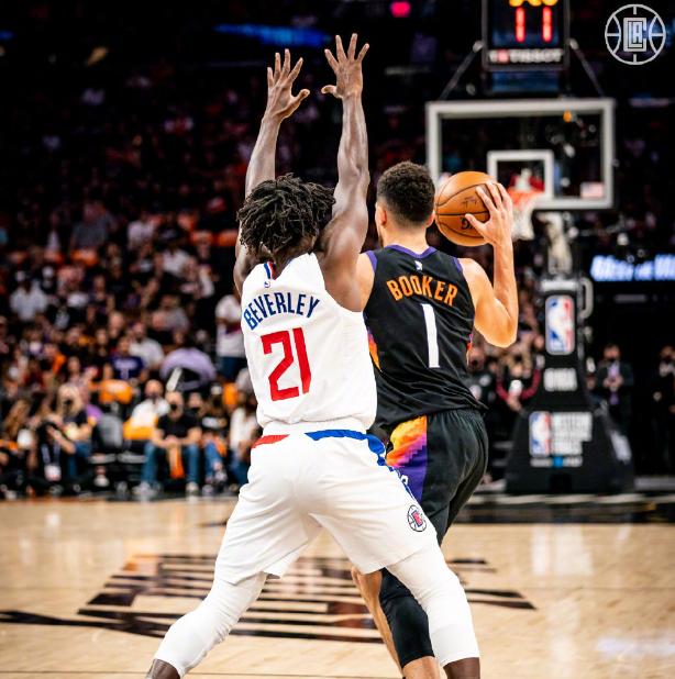 快船队防守布克有更好的选择,这个人就是贝弗利。西决第一场,贝弗利防守布克2分19秒,布克2投1中得到2分出现2次失误。这2分19秒里,布克不是不想出手,而是在无球时就被贝弗利缠绕和消耗,导致接球比较困难,这也体现出了贝弗利的防守效果。而2次失误也可以看出贝弗利对他的干扰有多大。比赛第四节,当布克再次连续得分时,卢指导就是让贝弗利去消耗布克的,第二场,他也可以继续相信贝弗利。