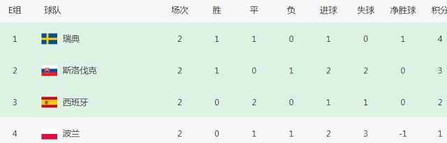 E组中瑞典达到4分,他们已经出线,斯洛伐克3分第2,西班牙2分第3,波兰1分垫底。这组其实实力很接近,前2轮并没有打出大比分的比赛,场面上也没有谁更占优,世界冠军西班牙前2轮居然只进了1球,实力有所衰落。最后一轮瑞典对阵波兰,斯洛伐克对阵西班牙,其实悬念很大,波兰尽管垫底,但是他们如果战胜瑞典,积4分也能出线,而斯洛伐克已拿到3分,只要逼平西班牙,积分达到4分更能以小组第2直接出线。