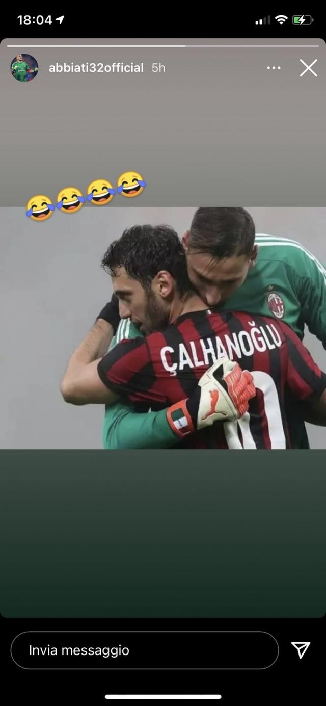 在社交媒体中,米兰名宿阿比亚蒂更新了一则动态,动态的内容是恰尔汗奥卢与多纳鲁马相拥的照片,而阿比亚蒂配上了四个笑哭表情。似乎意有所指。
