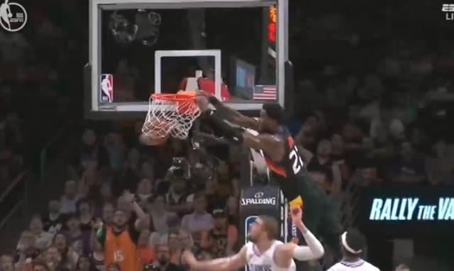 比赛首节中段,太阳打出防守反击,克劳德三分线外接球送给空切内线的艾顿,艾顿隔着祖巴茨完成空接暴扣,并造成对手犯规。