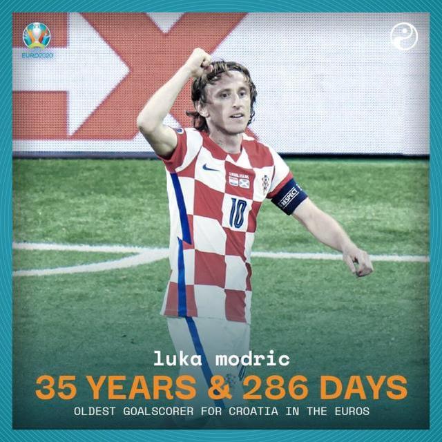 整整13年后,2021年6月22日,还是在东道主球迷的注视下,莫德里奇用外脚背轰入一记几乎是无解的世界波,以35岁286天的年纪,创造了克罗地亚球员在欧洲杯正赛的最年长进球纪录。