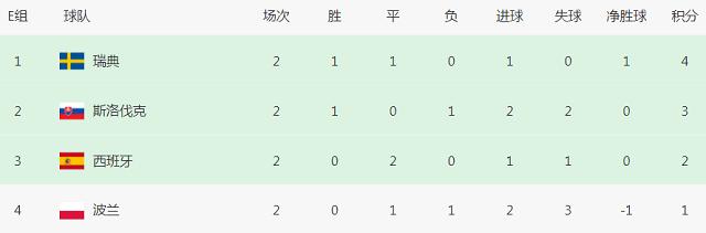 在E组中,瑞典积4分已经提前出线,斯洛伐克3分,西班牙2分,波兰1分,最后一轮瑞典对阵波兰,西班牙对阵斯洛伐克。瑞典无论输赢都能出线,而波兰则需要奋力一博。虽然瑞典已经提前出线,但是他们如果能击败波兰,确定E组第一,在淘汰赛中将能避开强队,并在赛程上有充裕的休息时间(E组第一6月30日才踢淘汰赛),所以他们还会全力出击,波兰虽然有世界第一中锋莱万,但是防守问题很大,很难战胜瑞典。