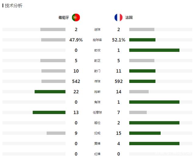 相对而言,葡萄牙的传接效率更强,对法国中场的渗透性更强,占据着相对主动。尤其葡萄牙在小范围内的控制明显见长,中场的传接点更多,对边路的利用率也更高。而法国队以跑代传,尽管遭遇了技术流葡萄牙地面传接的压制,但努力通过传跑配合尝试插入对方身后,也给葡萄牙的防守造成威胁。可以说,两支强队都在暗中发挥出各自的特点,以求酝酿转机。