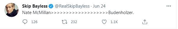 NBA名嘴斯利普-贝利斯在推特上写道:麦克米兰>布登霍尔泽,感觉每一步都是麦克米兰领先,布登霍尔泽这个最佳主教练实在是太水了!