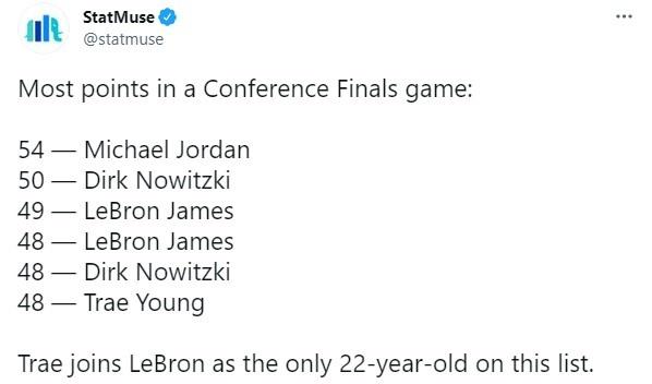 在NBA历史分区决赛单场得分榜上,乔丹以54分高居榜首,德克50分位居次席,詹姆斯49分第3,特雷-杨目前已经和詹姆斯、德克并列第4。