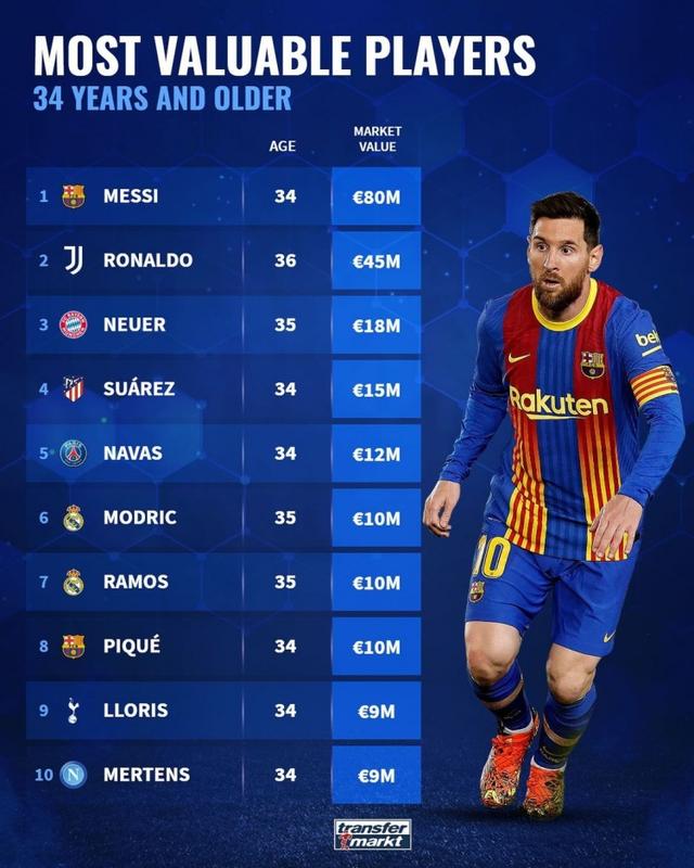 直播吧6月24日讯 今天是梅西34岁生日,德转借此评选了年龄34+球员的身价排行,梅西以8000万欧领跑,C罗4500万欧第二。