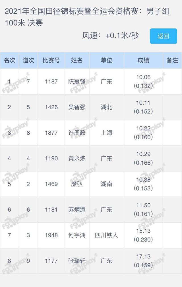 本站黑马陈冠锋的10秒06可圈可点,他仅仅才20岁。已经超越了同时期的苏炳添和谢震业,这就是新生的力量,后生可畏!并且10秒06是在顺风0.1米/秒的情况下跑出来的,含金量十足。美中不足的是他遗憾的未能达标东京奥运会的参赛线10秒05,但是这依然不影响他参加东京奥运会,他会是东京奥运会百米单项的第三人,携手苏炳添谢震业挂起亚洲旋风。
