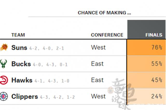 快船队打赢G3之后,美媒《fivethirtyeight》更新了预测,在他们的最新预测中太阳队晋级总决赛的概率为76%、雄鹿为55%、老鹰为45%、快船为24%,太阳队的概率比快船高出52%,这完全可以理解,可老鹰的晋级概率仅有45%、这比雄鹿还低了10%,这就有些让人感到意外了,为什么老鹰队赢了东距G1还不被看好呢?这里章鱼不妨略微分析一下,本文这3大理由或就是美媒不看好他们的关键?