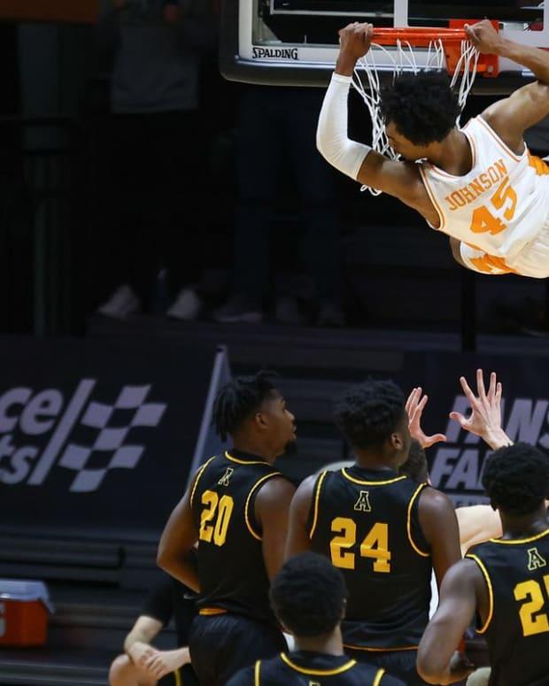 Keon Johnson来自田纳西大学,身高1米96、臂展203、体重84公斤,在先前ESPN官方选秀预测当中,他能够位列乐透前8的位置。