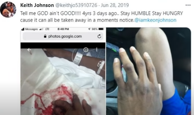 烟花爆炸之后,Keon Johnson被炸飞了数米并陷入昏迷,而弟弟因为躲在一旁幸免于难。被送往医院之后,医生在Keon Johnson的口袋里发现了一部被炸烂的手机,也就是这部手机,奇迹般地保护了Keon Johnson的腹股沟,让他捡回了一条性命。