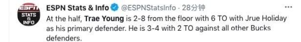 在霍勒迪的防守下,特雷杨全场出现9次失误,老鹰全线崩盘。半场落后32分,三节落后40分,最终被打出一场NBA惨案。