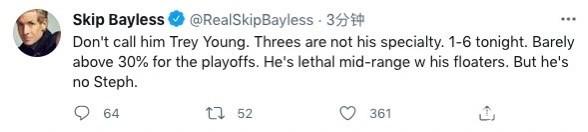 整个季后赛至今,原本有着一手三分技能的特雷杨,三分命中率仅仅32.8%,这是老鹰无法突破上限最大原因,总是看起来和真正强队有些距离,核心持球手的外线进攻威胁不够,一旦被限制就会让整支队伍的进攻瘫痪。名记斯基普-贝勒斯更是直言现在的特雷杨还远不能和库里相比。