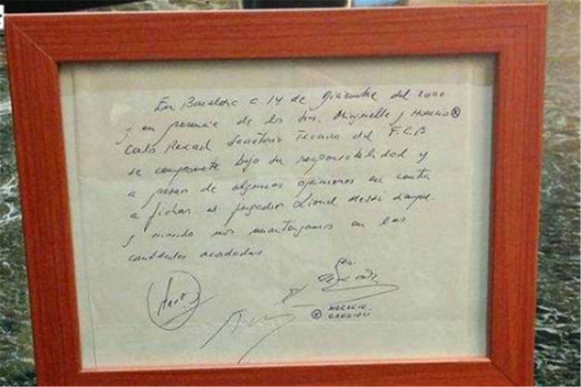 2000年12月,明哥利亚和雷克萨奇吃饭,正好谈到梅西签约的问题,雷克萨奇答应先签个简单的协议,讲求实质重于形式的明戈利亚,顺手拿来了一张餐巾纸,让雷克萨奇在上面写了个保证书,这就是著名的签下梅西的餐巾纸。