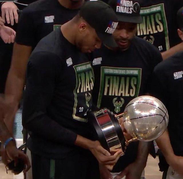 那一刻字母哥自然是百感交集,他调整了情绪,随后,跟队友一起拍合照。字母哥还要求队友等等米德尔顿,拍完照片,字母哥又一把抱起了奖杯,像爱护自己的孩子一样,抚摸着它。