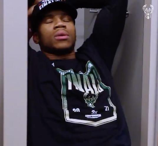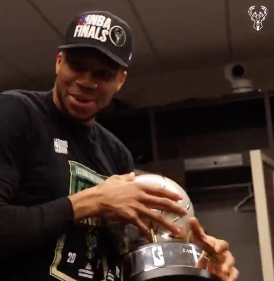字母哥朝镜头挥挥手,他想抱着奖杯一个人静静。主帅布登霍尔泽发表讲话,肯定了队员的努力,鼓舞全队为总决赛继续加油。在布帅讲话的时候,字母哥独自一人坐在角落,抱着奖杯陷入沉思。