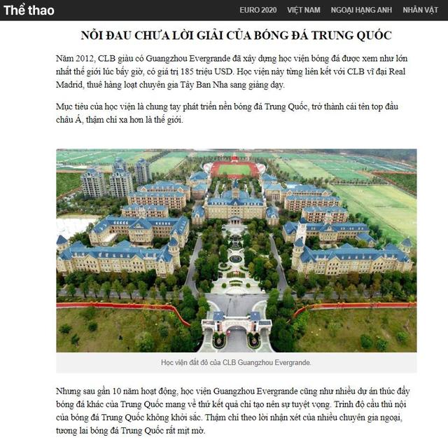 这篇报道接下来介绍了我国某俱乐部造价1.85亿美元的足球学校,但他称其结果是令人绝望的。究其原因,这位越南作者认为一方面是我国的体育人才培养方式会让运动员在成长过程中承受巨大的身心痛苦,另一方面许多家长送孩子学踢球只是为了通过这个途径进名校。