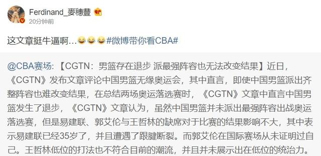 微博原文写道:“近日,《CGTN》发布文章评论中国男篮无缘奥运会,其中直言,即使中国男篮派出齐整阵容也难改变结果,在总结两场奥运落选赛时,《CGTN》文章中直言中国男篮发生了退步,《CGTN》文章认为,虽然中国男篮并未派出最强阵容出战奥运落选赛,但是易建联、郭艾伦与王哲林的缺席对于比赛的结果影响不大,其中表示易建联已经35岁了,并且遭遇了跟腱断裂。而郭艾伦在国际赛场从未证明过自己。王哲林低位的打法也不符合目前的潮流,并且并未展示出在低位的统治力。”
