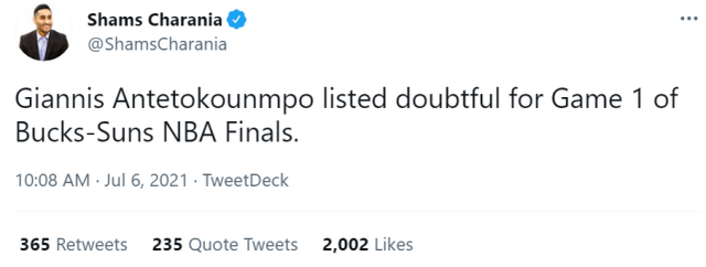 北京时间7月6日,名记查拉尼亚报道称,字母哥的总决赛G1出战状态为doubtful(大概率休战,出场可能性仅25%)。字母哥左膝过度伸展的伤势,已经明显好转,他没有参加今天的媒体采访,前方记者报道称,字母哥在一个私人球馆进行秘密训练,取得重大进展。