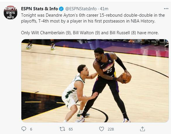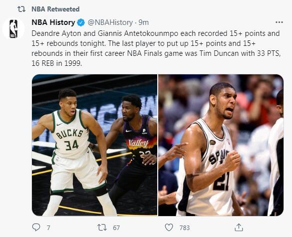 1.艾顿与字母哥生涯首次总决赛都拿下至少15分+15篮板,是1999年邓肯后首人