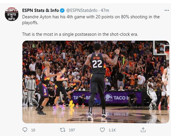 艾顿此役的光芒完全盖过布克,布克是21中8,三分8中1,拿下27分6助攻,命中率38.1%,三分命中率12.5%,他完全是依靠各种造犯规才拿下27分,艾顿明显效率值更高。
