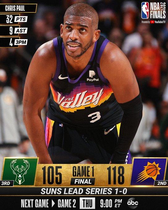 克里斯-保罗19中12,三分7中4拿下32分9助攻4篮板3抢断带领太阳大胜雄鹿,总决赛1-0领先!这场比赛球迷们都在盛赞“控卫之神”如何统治比赛,第三节单节16分,末节关键中距离+空接艾顿锁定胜局,保罗实在是厉害炸天了。