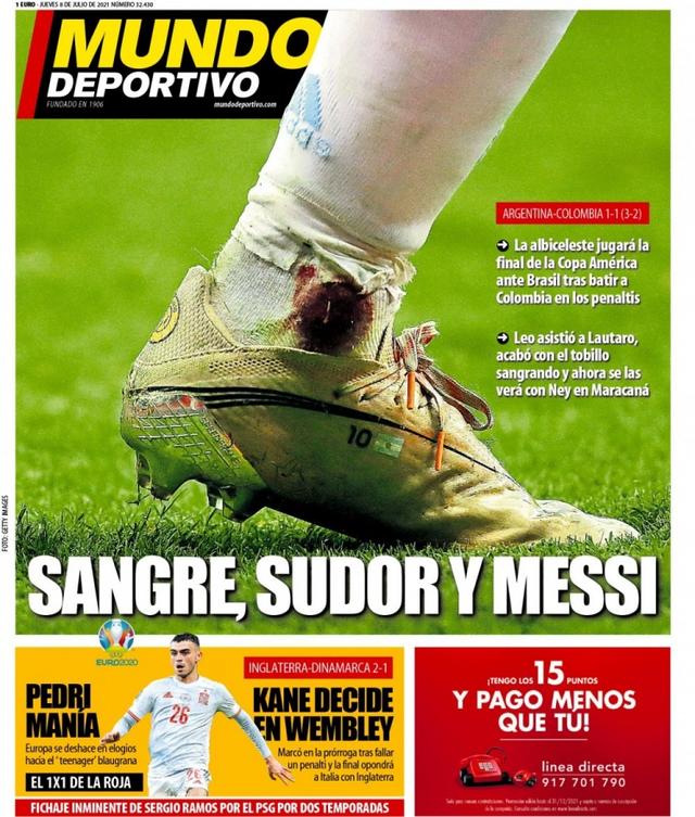 1、“鲜血、汗水和梅西”,阿根廷在美洲杯半决赛中1-1战平哥伦比亚、点球大战3-2力克对手杀入决赛,他们将与巴西争夺冠军,梅西在比赛中助攻劳塔罗进球,之后脚踝被踢出血,现在他将在马拉卡纳球场与内马尔进行较量。