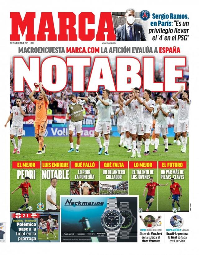 1、“出色的”,球迷们在《马卡报》的民意调查中给西班牙打了不错的分数,最佳球员是佩德里,恩里克的分数同样出色,不足的是西班牙缺少一位锋线杀手,进球效率不高。不过,西班牙的年轻球员们让人们期待。