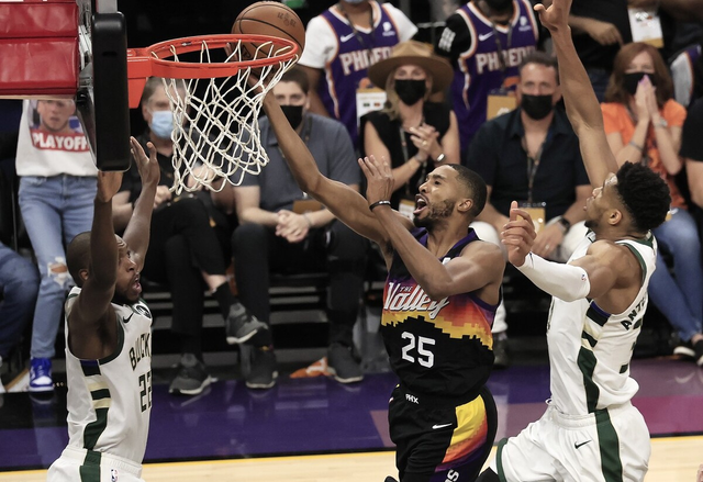 总决赛第一场比赛,字母匆匆复出。从某种程度上说,他复出的不是时候。如果从战略角度来看,第一场比赛是相互试探的过程。字母哥可以坐在场下观战,看看对手能玩出什么花样。字母哥不出,雄鹿就有秘密武器,太阳一直就要一直做两手准备,会分散一些精力。从阵容打法角度来说,可以继续以米德尔顿为核心进行冲击。