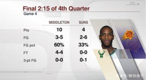雄鹿这边米德尔顿成功变身米神,第四节最后最后2分15秒米德尔顿一人10分,太阳全队仅拿4分,全场40分6板4助!字母哥26分14板8助,关键补防盖掉艾顿的空中接力扣篮令人惊呼:“wow!”;霍乐迪13分7板7助,他进攻依然挣扎,但防守在线,让保罗苦不堪言;洛佩兹14分,康诺顿11分9板;塔克5板,波蒂斯3分5板。