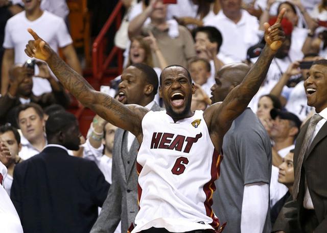 13年,志在卫冕的南海岸军团,继续保持着超强的竞争力,该赛季他们在常规赛取得了66胜16负,东部第一的佳绩,在首轮轻松横扫了雄鹿,次轮面对公牛同样在5场比赛轻松解决战斗,而到了东决对战步行者,热火终于遭到了严峻的挑战,好在通过抢七他们还是有惊无险地连续3年杀入总决赛舞台。但这次他们所面临的对手,不再是之前缺乏经验的雷霆,而是由老帅波波维奇率领的老道马刺。前3场比赛,詹姆斯手感极为低迷,场均仅有17分入账,不过从第四场比赛开始,詹姆斯终于爆发,得分一直维持在25+。在关键的第六场比赛中,如果不是靠着詹姆斯全场砍下32分10篮板11助攻的大三双,估计也没有之后波什抢下关键的前场篮板球,然后丢给底线的雷阿伦命中那记致命三分的经典画面出现了。而正是拿下这场关键的逆转胜利,让热火在抢七一战中以95比88击败马刺,卫冕成功,而这一年的总决赛,詹姆斯场均拿下25.3分10.9篮板7助攻,毫无疑问,应该是他这4次夺得冠军的总决赛中,表现最差的一次了。