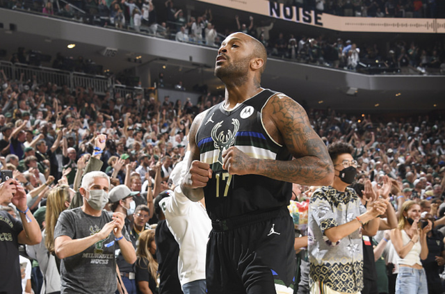 本场比赛出战36分钟,1中0,一共拿到0分6篮板1助攻1抢断的塔克,赛后则成为雄鹿队友眼中的大功臣,在比赛还没结束时,字母哥就跳起来熊抱塔克,全场哨响时,霍勒迪、波蒂斯和蒂格冲过来和塔克击掌庆祝,雄鹿助教则拉着塔克来到场边接受球迷的欢呼和掌声,塔克的妻子带着小女儿也来到场中央,接受荣耀洗礼。很意外,0分6篮板,在场正负值+13,全场最高!而在赛后,包括字母哥和米德尔顿都在接受采访时谈到了塔克,用米德尔顿的话来说,塔克是不可替代的存在,在总冠军庆祝环节,塔克眼含热泪,圆梦了!