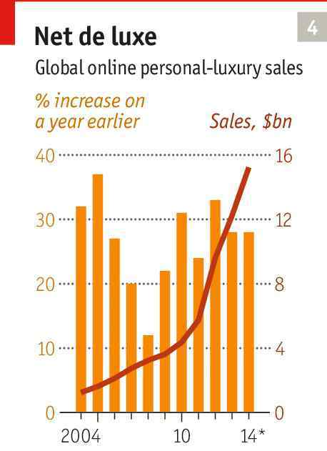 证券经纪公司桑福德·伯恩斯坦(Sanford C. Bernstein)预测,未来奢侈品电子商务的增长速度将是整个奢侈品行业的两倍,到2019年,在线奢侈品交易额将达到270亿欧元。